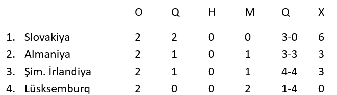 Almanlar bu dəfə sensasiyaya imkan vermədi. Doğrudur, yalnız 69-cu dəqiqədə bundestim hesabda irəli çıxmaqla azarkeşlərinin əsəbi ilə oynadı. Slovakiya isə gözlənilmədən səfərdə böyük çətinliklə Lüksemburqun qapısına yol tapa bildi. Yeganə qolu slovaklar yalnız 90-cı dəqiqədə vurdu. Bununla da iki oyuna iki qələbə ilə Slovakiya bu turu lider kimi qapadı.